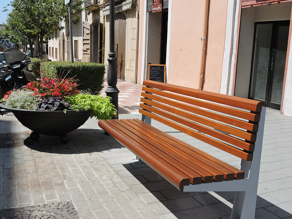 Final view of the installation of Ronda Bench and flower box in the streets of Alella, province of Barcelona, Spain.