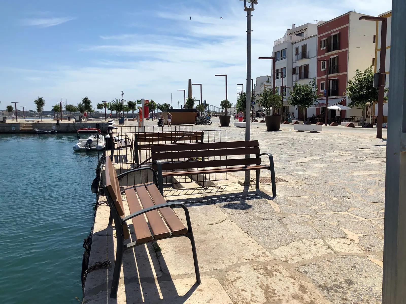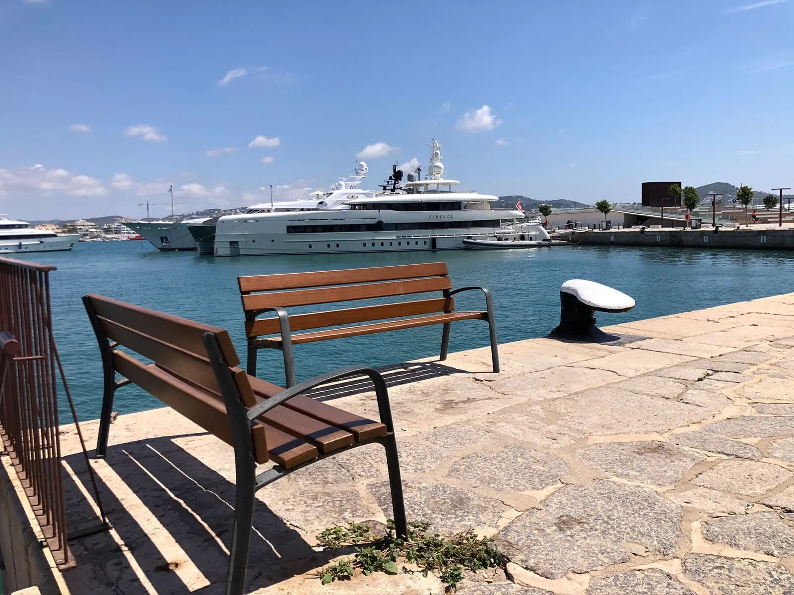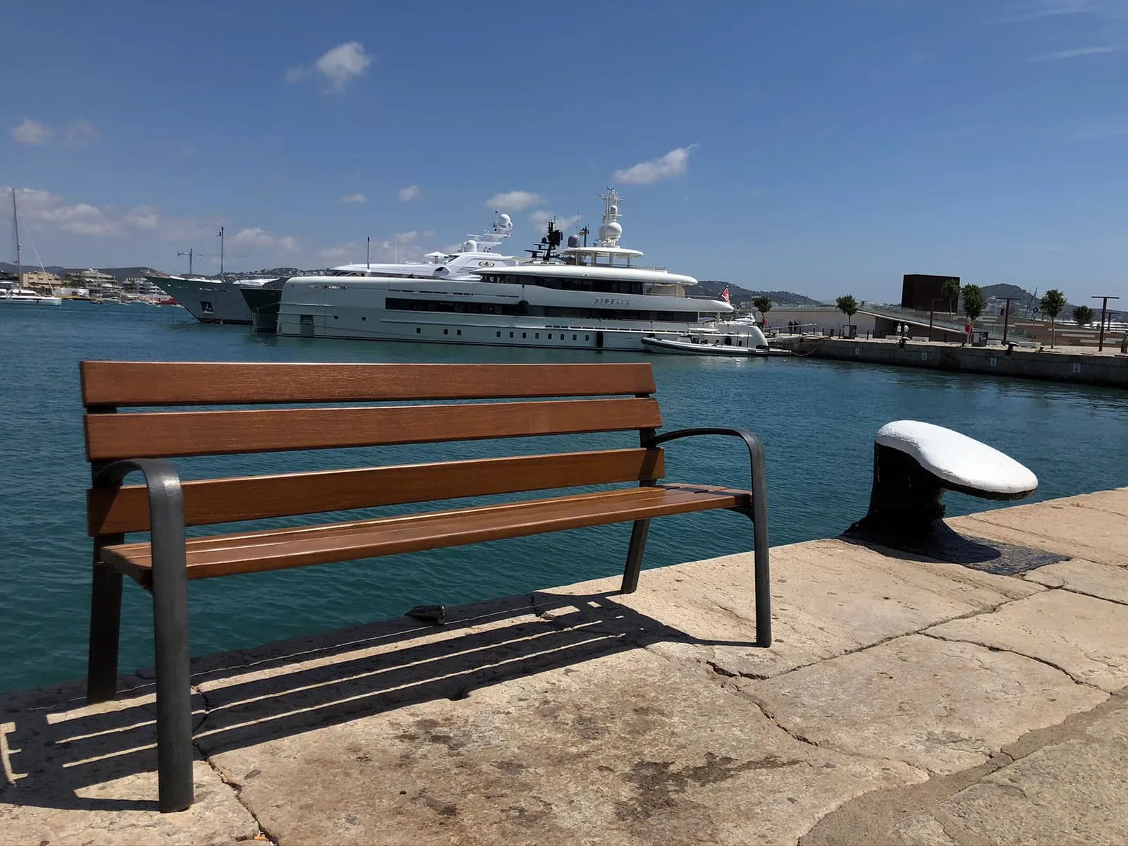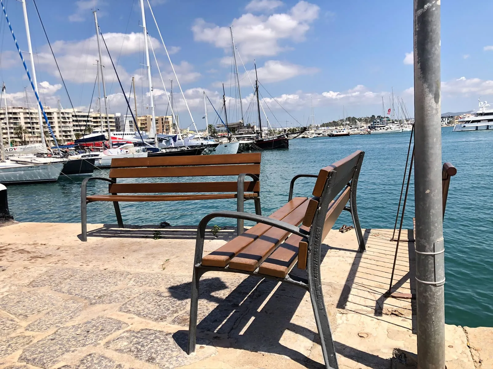 Placement of classic wooden Modo benches in the Marina Botafoc in Ibiza.