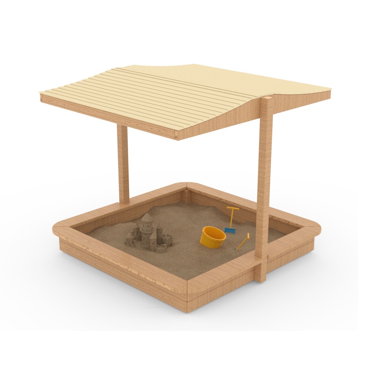 Barco de arena con techo, fabricado en madera de Robinia con medidas: 3450 x 1530 x 2000 mm.