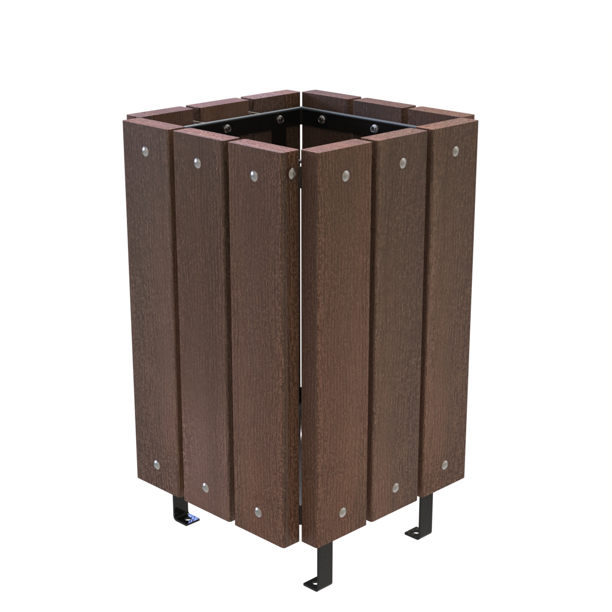 Papelera modelo Canadá de estructura de acero pintado epoxi al horno y listones de plástico 100% reciclado de color marrón de medidas generales 420 x 420 x 700 mm, con capacidad para 55 Litros.