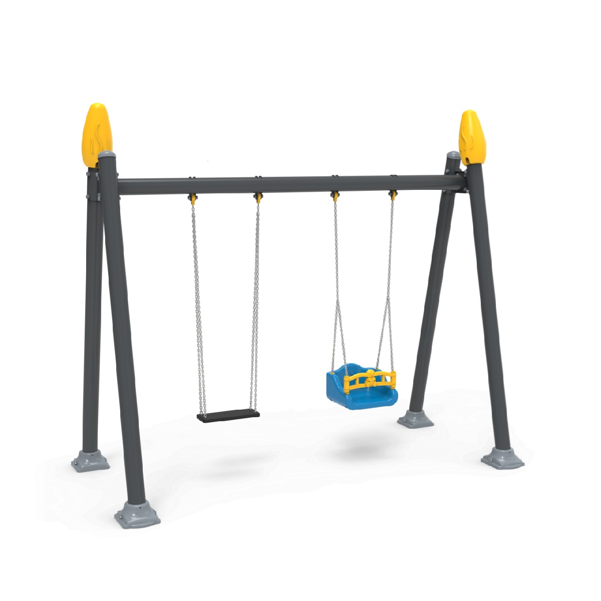 Columpio de dos plazas para bebes, con estructura de acero, dispone de cadenas de acero galvanizado y asientos de caucho, medidas: 3.130 x 1.550 x 2.700 mm.