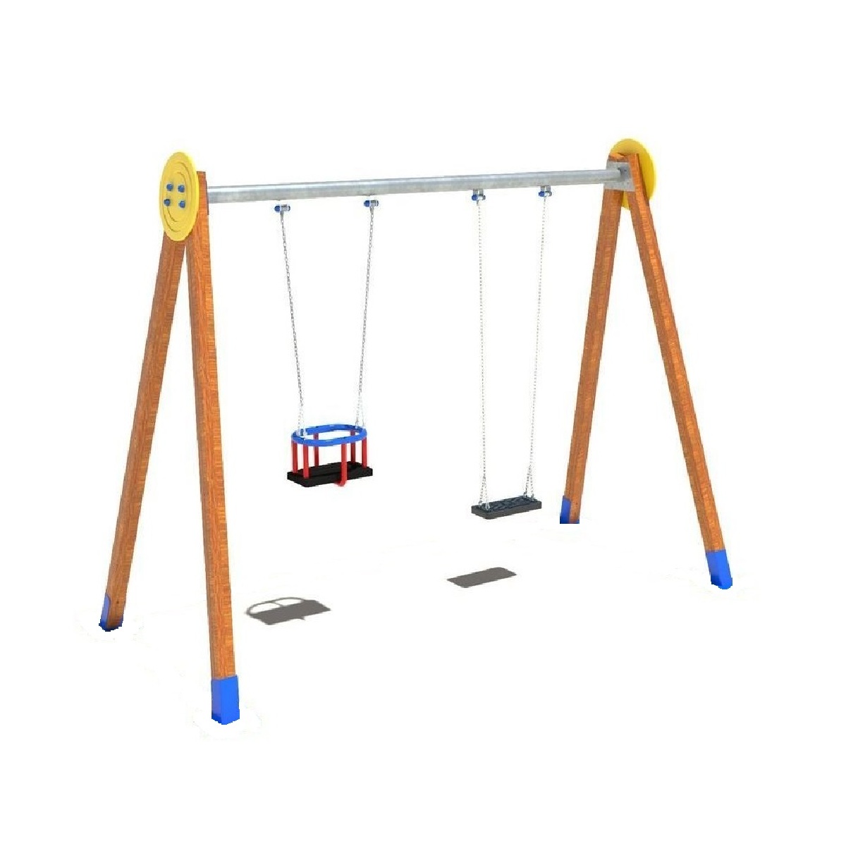 Columpio de dos plazas mixto con asiento para bebes para empotrar, postes de madera laminada y tratada en autoclave, embellecedores en polietileno, dispone de travesaño, cadenas de acero galvanizado y asientos de caucho. Medidas: 3.610 x 1.670 x 2.700 mm.