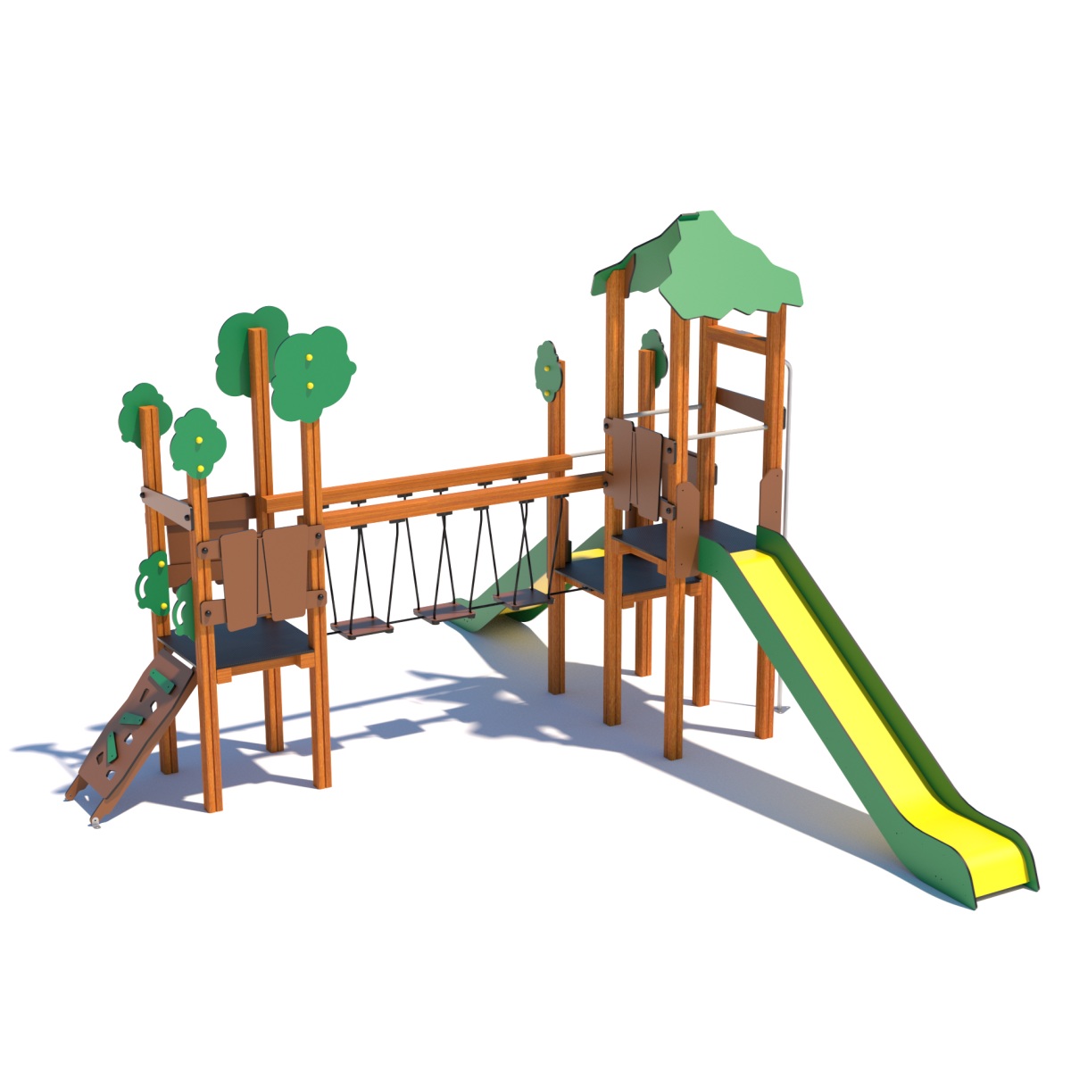 Juego multiactividades con Torre básica con un tobogán de salida, con estructura principal formada por 4 postes de madera, paneles de polietileno de alta densidad (PEHD), con una rampa de acceso.