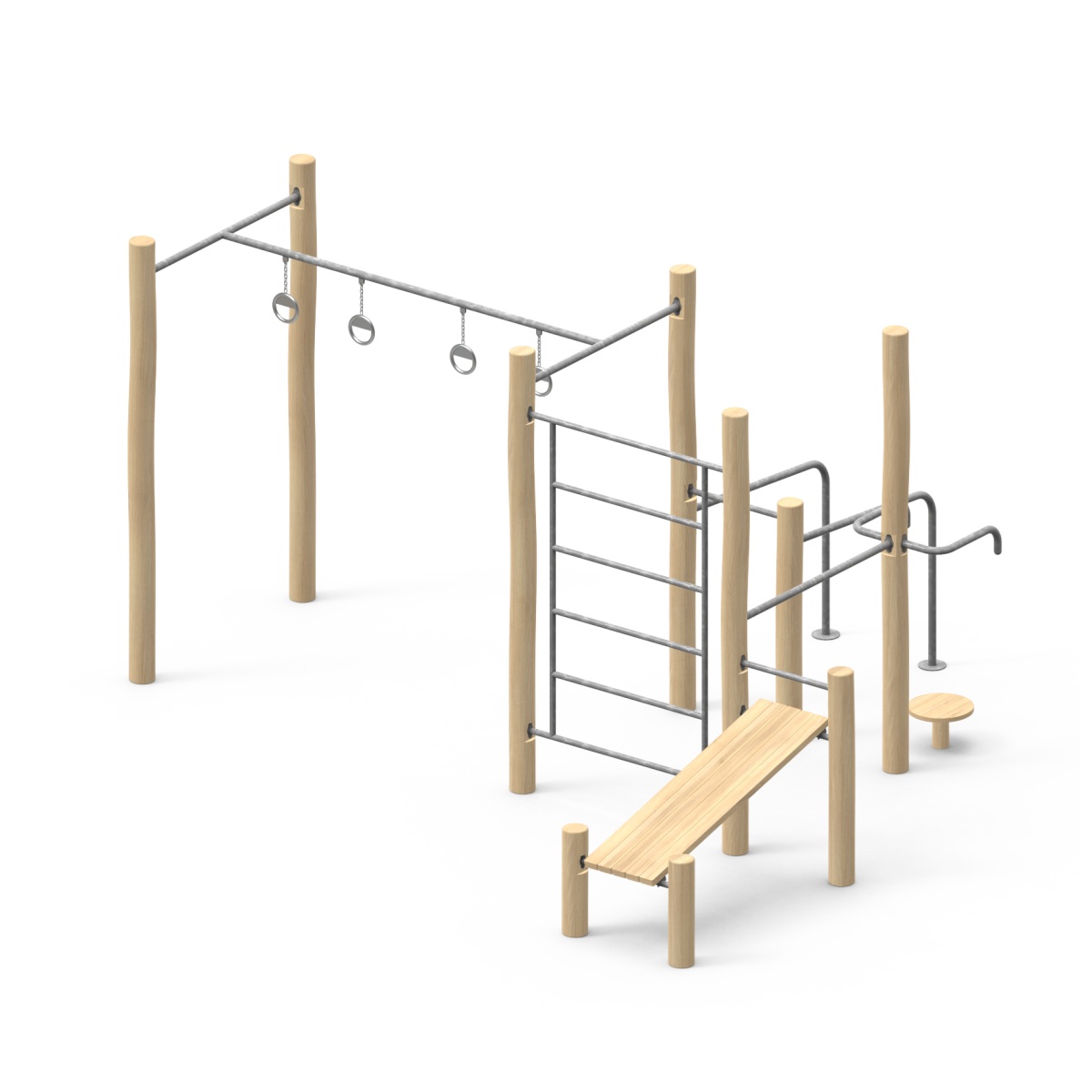 Street Workout – Barras altas, con postes, estructura y barras en acero galvanizado, dispone de varios módulos para ejercitar los músculos y panel para escalar, de medidas genéricas: 3440 x 1550 x 2640 mm.